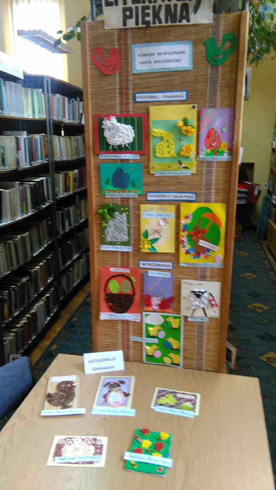 W dniu 19 kwietnia 2017 r. w Miejsko Gminnej Bibliotece Publicznej w Woźnikach został rozstrzygnięty konkurs plastyczny na wykonanie kartki wielkanocnej . Konkurs skierowany był dla przedszkolaków , uczniów Szkół Podstawowych klas I- VI i Gimnazjum z naszej Gminy.