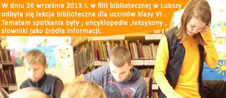 04 czerwca 2013 r. filia biblioteczna w Lubszy zorganizowała dla uczniów klas I, II i III Szkoły Podstawowej lekcje biblioteczne.