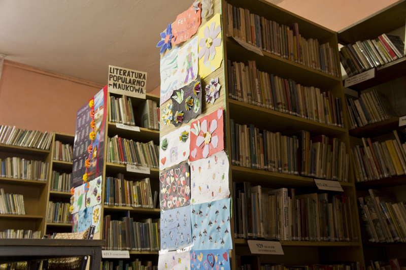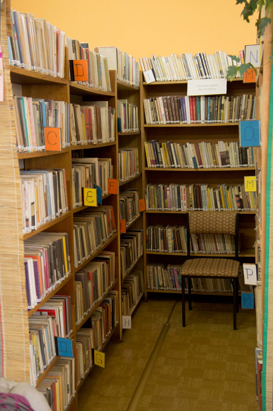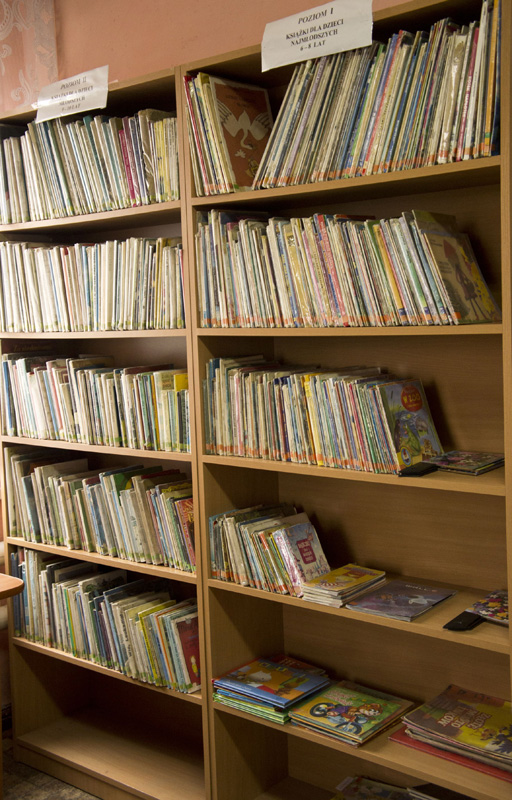 W pierwszym lokalu znajduje się księgozbiór podręczny oraz literatura dla dzieci i młodzieży.