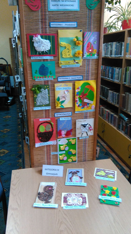 W dniu 19 kwietnia 2017 r. w Miejsko Gminnej Bibliotece Publicznej w Woźnikach został rozstrzygnięty konkurs plastyczny na wykonanie kartki wielkanocnej . Konkurs skierowany był dla przedszkolaków , uczniów Szkół Podstawowych klas I- VI i Gimnazjum z naszej Gminy.