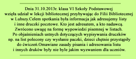Dnia 31.10.2013r. klasa VI Szkoły Podstawowej wzięła udział w lekcji bibliotecznej przybywając do Filii Bibliotecznej w Lubszy.